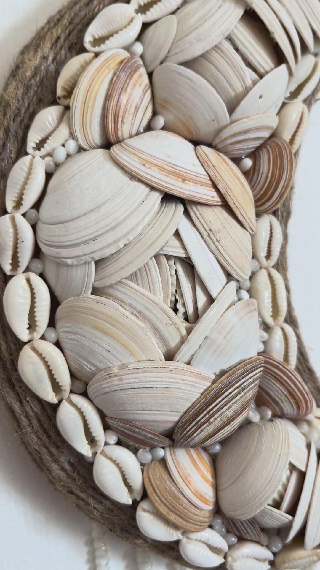 Croissant de lune bohème et élégant en corde, bois et coquillages de la côte Atlantique 100 % naturel. Décoration murale pour ajouter une touche bohème à votre intérieur.